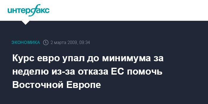 Москва. 2 марта. INTERFAX.RU - Курс евро к доллару США упал до минимума за неделю после того, как главы стран Евросоюза ответили отказом на просьбы государств Восточной Европы оказать им финансовую поддержку. Инвесторы выражают опасения, что финансовый кризис в Восточной Европе приведет к углублению и затягиванию общеевропейской рецессии, сообщило агентство Bloomberg.