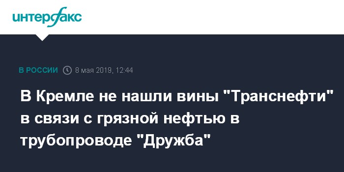 Москва. 8 мая. INTERFAX.RU - Пресс-секретарь президента РФ Дмитрий Песков отметил, что Минэнерго не зафиксировало каких-либо неверных действий руководства "Транснефти" в связи с попаданием "грязной нефти" в трубопровод "Дружба".