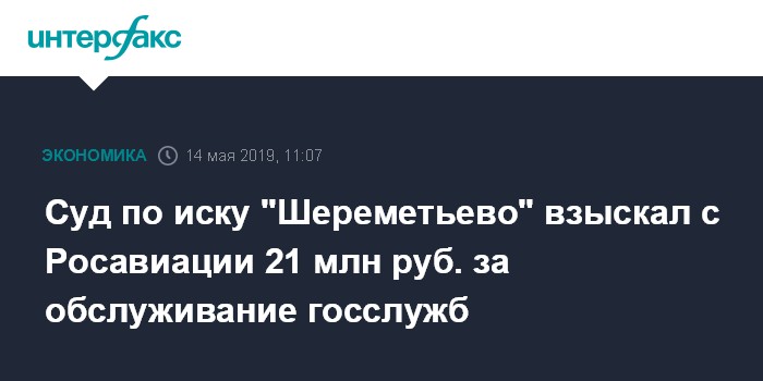 Москва. 14 мая. INTERFAX.RU - Арбитражный суд Москвы во вторник удовлетворил иск АО "Международный аэропорт "Шереметьево" (МАШ) о взыскании с Росавиации 20,6 млн рублей убытков за 2016 год, передал корреспондент "Интерфакса" из суда.