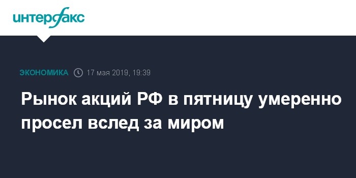 Москва. 17 мая. INTERFAX.RU - Рынок акций РФ завершил торги в пятницу умеренным снижением по индексам вслед за мировыми площадками и нефтью в рамках коррекции на опасениях, что власти КНР сомневаются в целесообразности продолжения торговых переговоров с США. Локомотивом отката выступили прежние фавориты - бумаги "Интер РАО" и "Газпрома", а раллировали к максимумам с февраля 2017 года акции "Россетей" .
