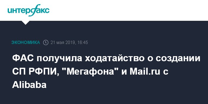 Москва. 21 мая. INTERFAX.RU - Федеральная антимонопольная служба (ФАС) получила ходатайство в связи с созданием совместного предприятия Российского фонда прямых инвестиций (РФПИ), Alibaba, Mail.ru и "Мегафона", сообщил "Интерфаксу" источник, знакомый с содержанием заявки.