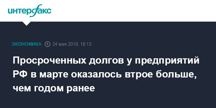 Москва. 24 мая. INTERFAX.RU - Просроченная кредиторская задолженность российских предприятий и организаций в марте 2019 года 31,2% по сравнению с тем же периодом прошлого года, сообщила в пятницу Федеральная служба государственной статистики РФ (Росстат).