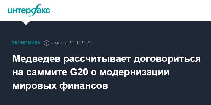 Медведев рассчитывает договориться на саммите G20 о модернизации мировых финансов