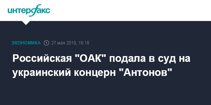 Москва. 27 мая. INTERFAX.RU - ПАО "Объединенная авиастроительная корпорация" (ОАК) подало в суд на украинский государственный авиационный концерн (ГАК) "Антонов", говорится в материалах судебной картотеки.