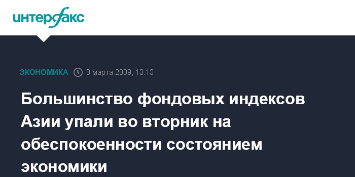 Москва. 3 марта. INTERFAX.RU - Большинство фондовых площадок сран Азиатско-Тихоокеанского региона во вторник продемонстрировали снижение на опасениях ухудшения экономической ситуации в регионе, сообщило агентство Bloomberg.