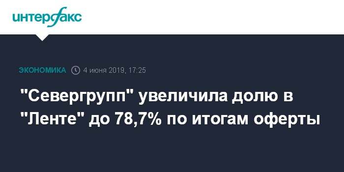Москва. 4 июня. INTERFAX.RU - "Севергрупп" Алексея Мордашова, которая в конце апреля приобрела 41,9% акций "Ленты" у TPG и ЕБРР, объявила о завершении срока действия оферты на приобретение акций у миноритариев.