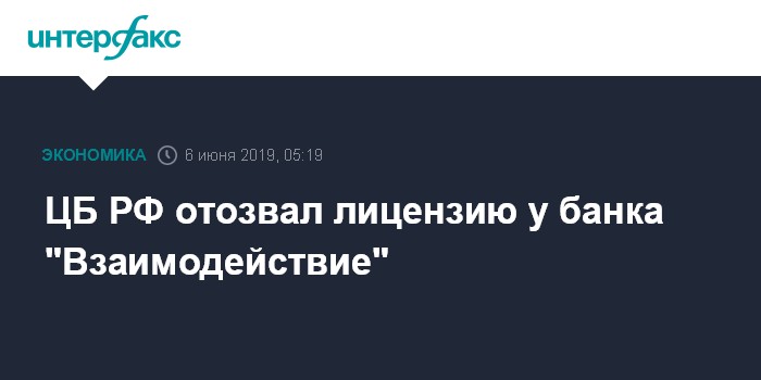 ЦБ РФ отозвал лицензию у банка "Взаимодействие"