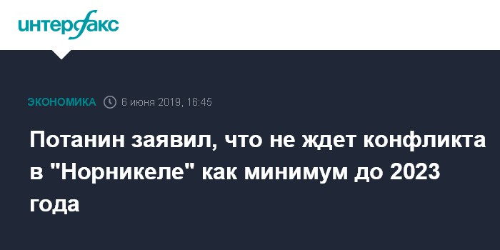 Москва. 6 июня. INTERFAX.RU - Президент и основной владелец "Норильского никеля" Владимир Потанин не ожидает рецидива акционерного конфликта в компании как минимум до 2023 года, когда истечет срок действия 10-летнего акционерного соглашения, завершившего предыдущий конфликт с Олегом Дерипаской.