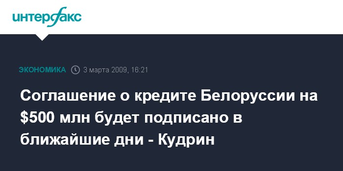 Москва. 3 марта. INTERFAX.RU - Соглашение о выделении кредита Белоруссии на $500 млн будет подписано в ближайшие дни, сообщил вице-премьер, министр финансов РФ Алексей Кудрин журналистам в Финансовой академии при правительстве РФ во вторник.