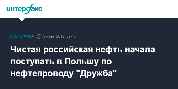 Москва. 9 июня. INTERFAX.RU - Чистая нефть из РФ по трубопроводу "Дружба" стала поступать в Польшу, сообщил журналистам советник президента "Транснефти", пресс-секретарь Игорь Демин.