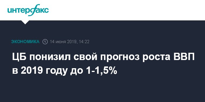 Москва. 14 июня. INTERFAX.RU - ЦБ РФ понизил свой прогноз по росту ВВП РФ на 2019 год до 1,0-1,5% с 1,2-1,7% из-за слабого первого квартала, оставив неизменным прогноз на 2020 год - 1,8-2,3% и на 2021 год - 2-3%. Об этом говорится в среднесрочном прогнозе ЦБ, опубликованном по итогам заседания совета директоров, на котором он понизил ключевую ставку до 7,5% с 7,75%.