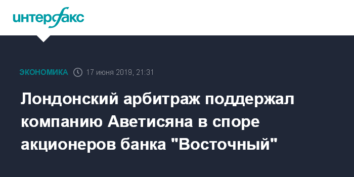 Москва. 17 июня. INTERFAX.RU - Трибунал Лондонского международного арбитража (LCIA) признал за компанией "Финвижн" Артема Аветисяна право требовать исполнения опциона на покупку 9,99% банка "Восточный". Об этом пишут "Ведомости" со ссылкой на копию решения суда от 14 июня. Подлинность документа изданию подтвердил источник, близкий к одной из сторон конфликта.