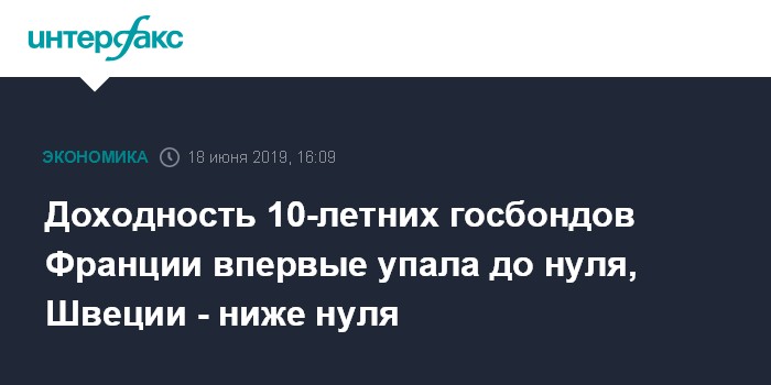 Москва. 18 июня. INTERFAX.RU - Доходность 10-летних гособлигаций Франции в ходе торгов во вторник упала на 11 базисных пунктов и теперь находится на нулевом уровне впервые в истории. При этом в Швеции доходность аналогичных гособлигаций впервые упала ниже нуля.