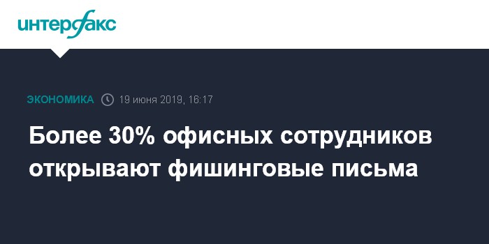 Москва. 19 июня. INTERFAX.RU - По оценке Сбербанка, сейчас в России больше 30% офисных работников имеют склонность открывать фишинговые письма. Об этом на пресс-конференции 19 июня сообщил зампред правления кредитной организации Станислав Кузнецов.