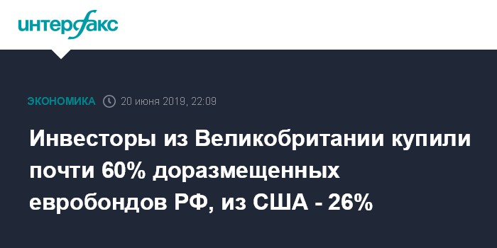 Москва. 20 июня. INTERFAX.RU - Инвесторы из Великобритании приобрели почти 60% от общего объема евробондов с погашением в 2029 и 2035 годах, доразмещенных Россией в четверг, следует из сообщения Минфина РФ.