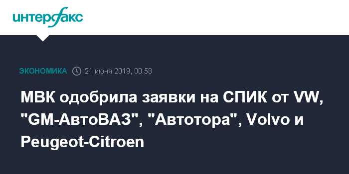 МВК одобрила заявки на СПИК от VW, "GM-АвтоВАЗ", "Автотора", Volvo и Peugeot-Citroen