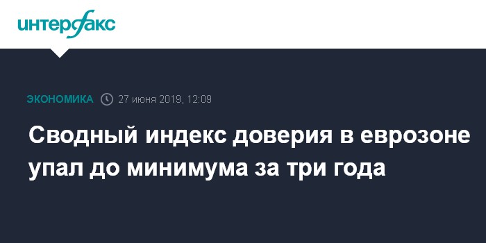 Москва. 27 июня. INTERFAX.RU - Сводный индекс делового и потребительского доверия к экономике еврозоны в июне 2019 года опустился до 103,3 пункта с пересмотренных 105,2 пункта в мае, свидетельствуют данные Европейской комиссии.
