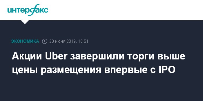 Москва. 28 июня. INTERFAX.RU - Бумаги сервиса по заказу такси Uber Technologies в четверг впервые завершили торги на Нью-йоркской фондовой бирже выше цены размещения, состоявшегося месяц назад.
