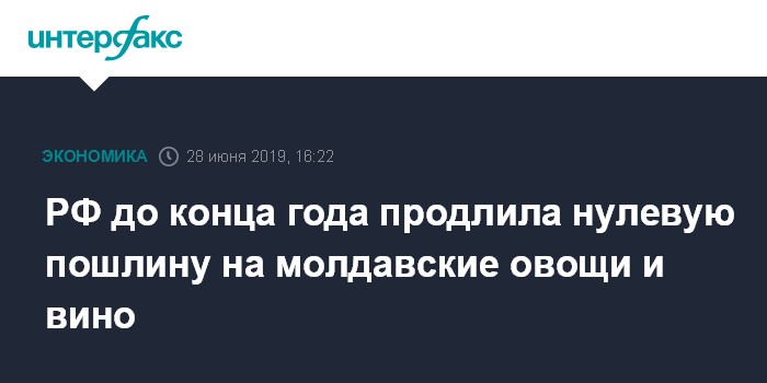 Москва. 28 июня. INTERFAX.RU - Россия продлила до 31 декабря 2019 года нулевую пошлину на ввоз некоторых продовольственных товаров из Молдавии.