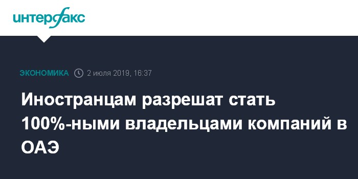 Москва. 2 июля. INTERFAX.RU - Правительство Объединенных Арабских Эмиратов разрешили иностранцам владеть 100% местных компаний в 122 отраслях экономики. Об этом в твиттере написал премьер-министр ОАЭ и эмир Дубая Мохаммед ибн Рашид Аль Мактум.