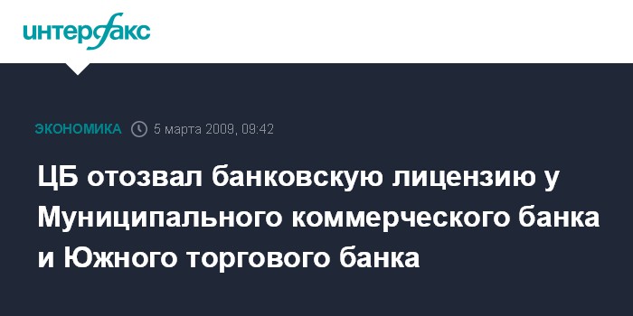 Москва. 5 марта. INTERFAX.RU - ЦБ РФ отозвал лицензию на осуществление банковских операций у Муниципального коммерческого банка (Калининград) и Южного торгового банка (Ростов-на-Дону), говорится в сообщении департамента внешних и общественных связей Банка России.