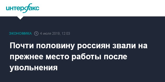 Москва. 4 июля. INTERFAX.RU - В России 45% трудящихся получали предложения вернуться на прежнее место работы, из них согласилась вернуться только треть, показал опрос экспертов портала Superjob.ru. Опрос провели с 18 по 22 июня среди 1600 взрослых россиян, имеющих опыт работы.