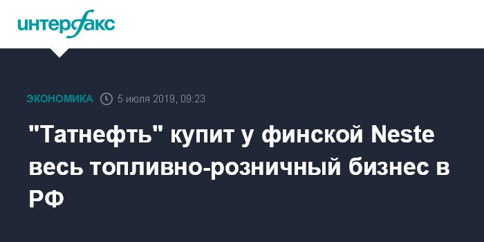 Москва. 5 июля. INTERFAX.RU - Финская корпорация Neste продает "Татнефти" свой топливно-розничный бизнес в России, состоящий из 75 АЗС и терминала в Петербурге, говорится в сообщении "Татнефти".