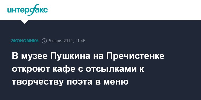 Москва. 5 июля. INTERFAX.RU - В Москве, в музее Пушкина на Пречистенке откроется концептуальное кафе, с меню, построенным в концепции в стиле пушкинских времен. В меню будут прямые отсылки к творчеству поэта. Об этом рассказал инвестор проекта Дмитрий Алферов.
