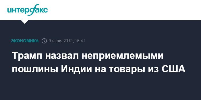Москва. 9 июля. INTERFAX.RU - Президент Дональд Трамп обвинил Индию в установлении завышенных пошлин на американские товары и назвал это неприемлемым.