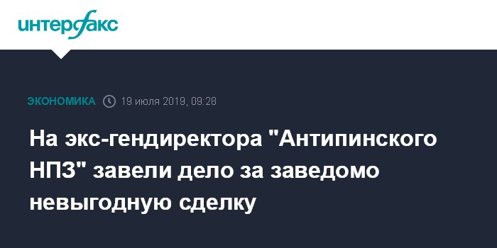 Москва. 19 июля. INTERFAX.RU - В Тюменской области возбудили уголовное дело в отношении бывшего гендиректора "Антипинского НПЗ". По версии следствия, он заключил невыгодную для завода сделку и нанес предприятию ущерб на сумму более 35 млн рублей, сообщает пресс-служба регионального управления СКР.