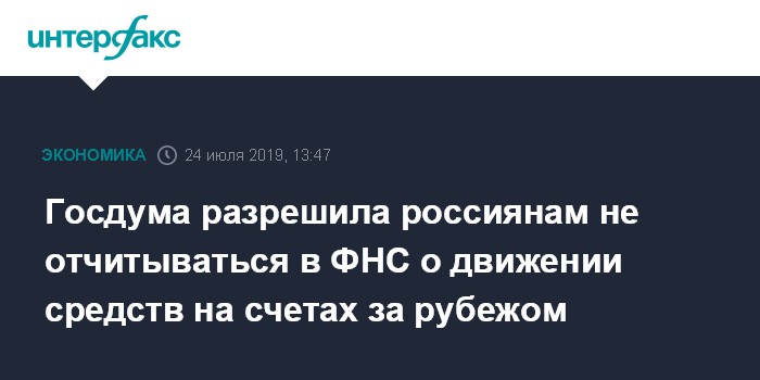 Москва. 24 июля. INTERFAX.RU - Госдума приняла в третьем, окончательном чтении закон, который наделяет граждан РФ правом не представлять в налоговые органы отчет о движении средств по зарубежным вкладам.