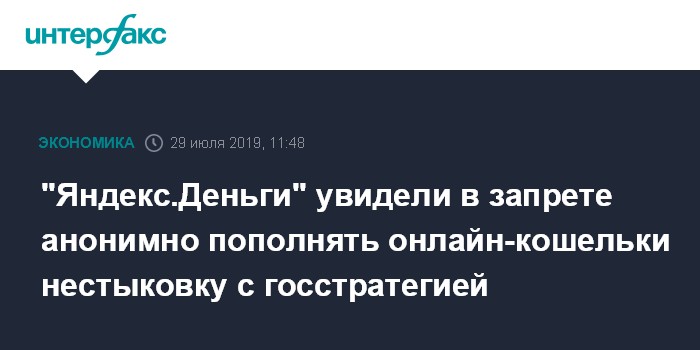 Москва. 29 июля. INTERFAX.RU - Законопроект о запрете пополнять анонимные электронные кошельки не только ущемляет бизнес операторов электронных денег, но и создает препятствия для достижения целей государственной стратегии повышения доступности финансовых услуг, заявили "Интерфаксу" в пресс-службе "Яндекс.Денег".