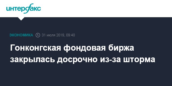 Москва. 31 июля. INTERFAX.RU - Торги на Гонконгской фондовой бирже в среду завершились досрочно из-за предупреждения о приближающемся тропическом шторме "Випха".
