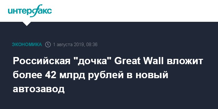 Москва. 1 августа. INTERFAX.RU - Российская "дочка" китайского автоконцерна Great Wall - ООО "Хавейл Мотор Мануфакчуринг Рус" - готово в рамках специального инвестиционного контракта (СПИК) вложить более 42 млрд рублей в создание автозавода с глубокой локализацией компонентов. Об этом сообщил Минпромторг РФ.