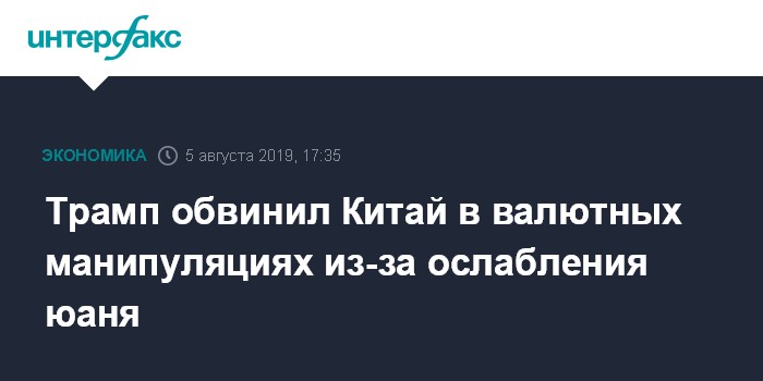 Москва. 5 августа. INTERFAX.RU - Президент США Дональд Трамп назвал резкое ослабление курса юаня валютной манипуляцией властей Китая и серьезным нарушением.