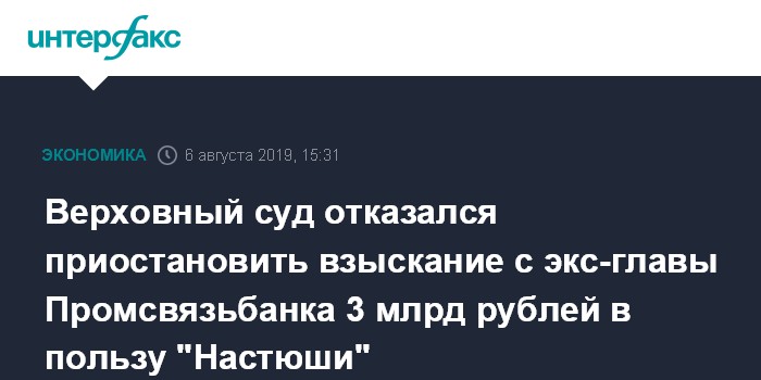 Верховный суд отказался приостановить взыскание с экс-главы Промсвязьбанка 3 млрд рублей в пользу "Настюши"