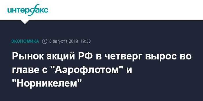 Москва. 8 августа. INTERFAX.RU - Рынок акций РФ в четверг вырос на фоне коррекционного отскока мировых фондовых площадок и нефти после падения, индекс РТС превысил 1300 пунктов, а индекс МосБиржи не смог удержаться выше 2700 пунктов из-за укрепления рубля; лидерами роста выступили бумаги "Аэрофлота" и обновившие исторический максимум на закрытие торгов бумаги "Норникеля", превысившие рубеж 15 тыс. рублей за штуку за счет ралли никеля.