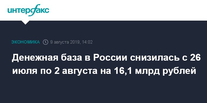 На 26 июля денежная база в России равнялась 10439 млрд рублей. Таким образом, за период она снизилась на 0,15%, или на 16,1 млрд рублей.