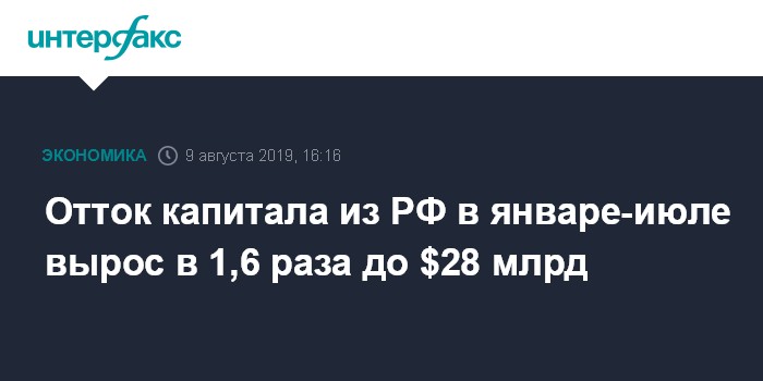Москва. 9 августа. INTERFAX.RU - Чистый отток капитала из РФ в январе-июле 2019 года, по оценке ЦБ, увеличился в 1,6 раза, до $28 млрд по сравнению с $17,4 млрд оттока за аналогичный период 2018 года, свидетельствуют материалы Банка России.