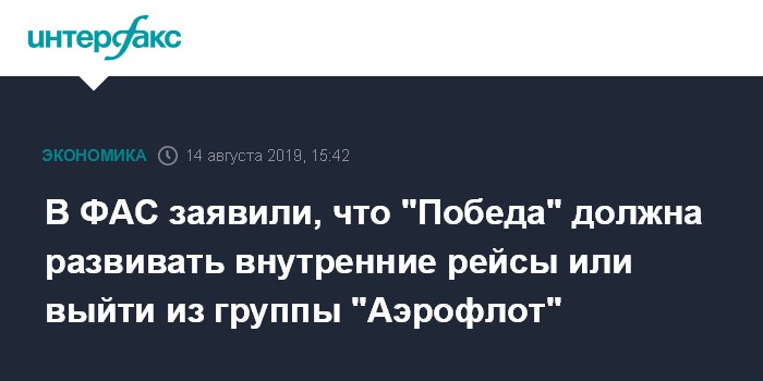 Москва. 14 августа. INTERFAX.RU - Авиакомпания "Победа" должна развивать рейсы внутри РФ или в противном случае выходить из группы "Аэрофлот", считают в Федеральной антимонопольной службе.