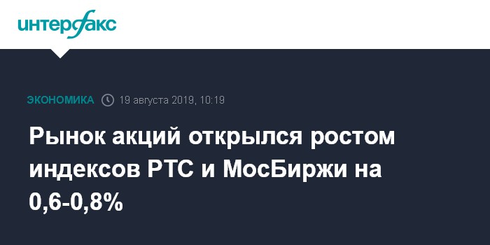 Москва. 19 августа. INTERFAX.RU - Рынок акций РФ открылся в понедельник коррекционным ростом цен blue chips и индексов на фоне подъема мировых площадок и нефти на новостях из КНР о реформировании системы процентных ставок; индексы РТС и МосБиржи за минуту торгов прибавили 0,6-0,8%.