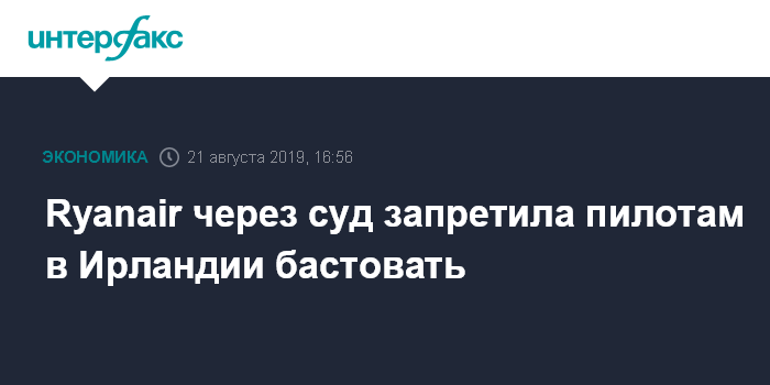 Москва. 21 августа. INTERFAX.RU - Высокий суд Дублина запретил работающим в Ирландии пилотам авиакомпании-лоукостера Ryanair бастовать 22 и 23 августа, сообщает ВВС.