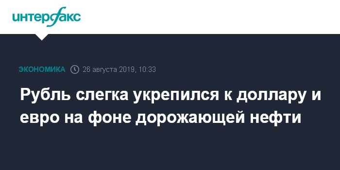 По мнению экспертов "Интерфакс-ЦЭА", плавное укрепление рубля к доллару и евро на старте торгов 26 августа связано прежде всего с наметившимся улучшением ситуации на мировых нефтяных площадках после их резкого падения в конце прошлой недели на фоне новой волны эскалации торгового конфликта между США и Китаем. Октябрьские фьючерсы на Brent на лондонской бирже ICE Futures к 10:01 по московскому времени подорожали на 0,25% - до $59,49 за баррель. На торгах в прошлую пятницу цена снизилась на 0,97% - до $59,34 за баррель. Стоимость фьючерса на WTI на октябрь на электронной сессии на Нью-йоркской товарной бирже к этому времени уменьшилась на 0,42%, до $53,94 за баррель. На предыдущих торгах WTI снизилась в цене на 2,13%, до $54,17 за баррель.
