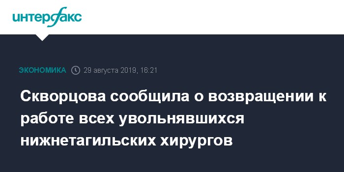 Москва. 29 августа. INTERFAX.RU - Все хирурги, которые ранее решили уволиться из двух больниц в Нижнем Тагиле, восстановились на работе, объявила глава Минздрава Вероника Скворцова. Она пообещала принять "самые жесткие меры" в связи с их массовым увольнением.