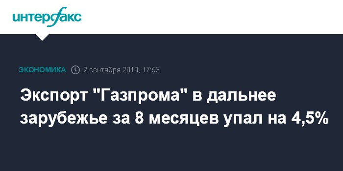 Москва. 2 сентября. INTERFAX.RU - В страны дальнего зарубежья за 8 месяцев 2019 года "Газпром" поставил 127,3 млрд куб м газа. Это на 4,5% меньше, чем за аналогичный период рекордного 2018 года.