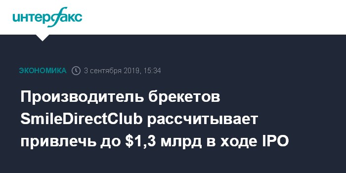 Москва. 3 сентября. INTERFAX.RU - В США сервис по производству ортодонтических брекетов SmileDirectClub, который работает с клиентами без непосредственного участия врачей, рассчитывает привлечь до $1,287 млрд за счет первичного размещения на бирже Nasdaq, говорится в документах сервиса.