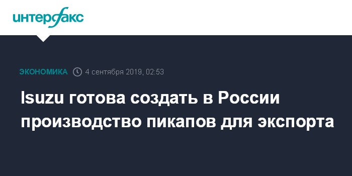Москва. 4 сентября. INTERFAX.RU - Isuzu после 2023 года будет готова организовать производство своих пикапов в России - как для внутреннего рынка, так и для экспорта, пишут в среду "Ведомости" со ссылкой на генерального директора "Исузу рус" (российская "дочка" японского автомобильного концерна) Фабриса Горлье.