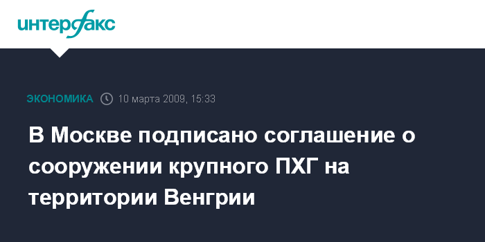 Москва. 10 марта. INTERFAX.RU - Россия и Венгрия подписали соглашение о сооружении крупного подземного газохранилища на территории Венгрии.