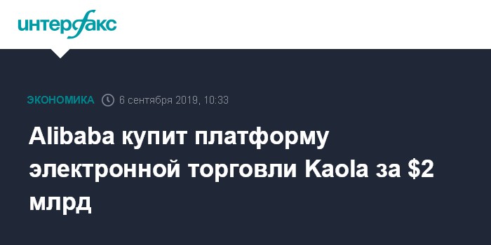 Москва. 6 сентября. INTERFAX.RU - Интернет-холдинг Alibaba Group договорилась с технологической компанией NetEase Inc. о покупке принадлежащей ей платформы для электронной торговли Kaola за $2 млрд. Об этом говорится в сообщении NetEase.