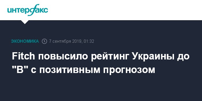 Москва. 7 сентября. INTERFAX.RU - Международное рейтинговое агентство Fitch Ratings повысило долгосрочные рейтинги дефолта эмитента (РДЭ) Украины в иностранной и национальной валюте с уровня "B-" до "B".